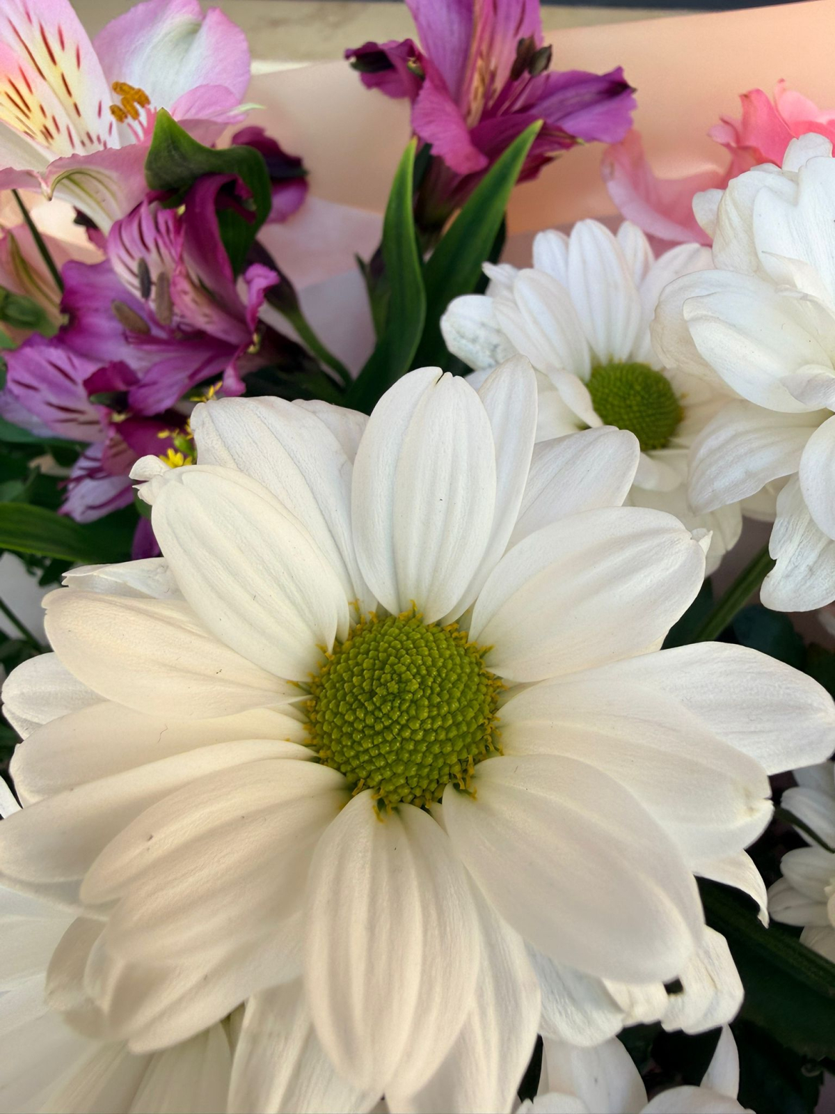 Aranjament cu trandafiri, crizantemă, solidago și alstroemeria.